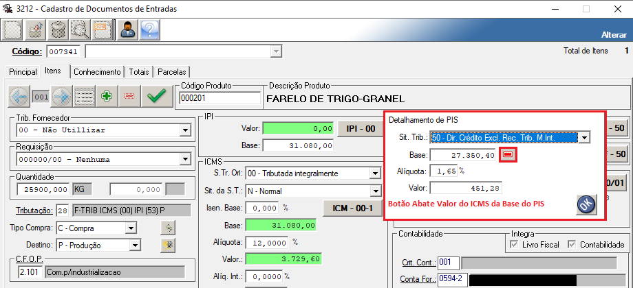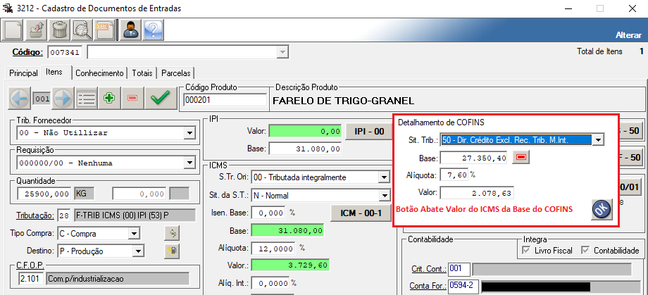 - Criado novo botão em '3212 - Cadastro de Documentos de Entradas - Aba Itens - Abate o Valor do ICMS da Base de Cálculo do PIS/COFINS', ao pressionar o botão o valor do ICMS do documento fiscal será abatido da Base de PIS/COFINS e os valores dos respectivos impostos serão recalculados. Esta função ficará disponível se habilitado o parâmetro em '1112 - Cadastro de Empresas - Aba Fiscal - Compras - Abate ICMS Base Pis/Cofins?'.