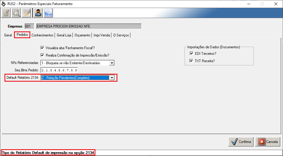 - Criado novo parâmetro em 'RUS2 - Parâmetros Especiais Faturamento - Aba - Pedido - Default Relatório 2134', na configuração será definido o modelo padrão utilizado no sistema ao acessar o relatório emitido pelo programa '2134 - Listagem de Pedidos'.